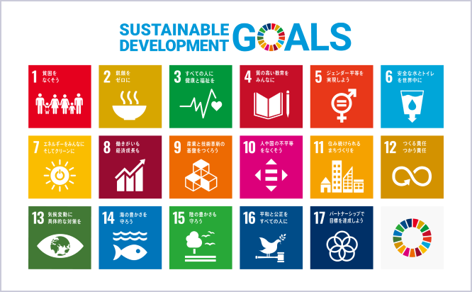 持続可能な開発目標SDGs(エス・ディー・ジーズ)とは、2015年9月の国連サミットで採択された国際目標です。17のゴール・169のターゲットから構成され、貧困・格差・気候変動など世界のさまざまな問題を2030年までに解決し、「誰一人取り残さない(leave no one behind)」ことを理念に掲げています。持続可能でより良い世界を目指すため、発展途上国のみならず、先進国自身が取り組むユニバーサル(普遍的)なものであり、日本としても積極的に取り組んでいます。